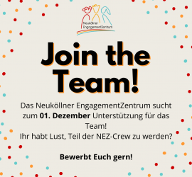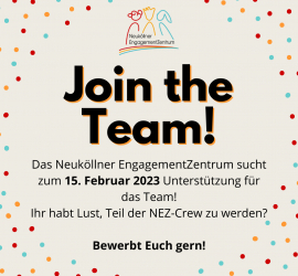 Wir vom Neuköllner EngagementZentrum (NEZ) suchen zum 15. Februar 2023 Verstärkung für unser Team mit dem Schwerpunkt auf Öffentlichkeitsarbeit! Bitte richtet eure Bewerbung ausschließlich an bewerbung[at]awo-suedost.de. Wir freuen uns auf eure Bewerbungen! Projektmitarbeiter*in zum 15. Februar 2023 für das NEZ, mit Schwerpunkt auf Öffentlichkeitsarbeit: