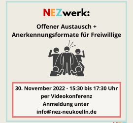 Liebe Kooperationspartner*innen, in unserem vierten und damit letzten NEZwerk in diesem Jahr möchten wir gern zu einem offenen Austausch einladen. Im kollegialen Rahmen könnt ihr hier eure Themen, etwa im Bereich Freiwilligenmanagement, besprechen und gemeinsam Erfahrungen austauschen. Im anschließenden zweiten Teil möchten wir mit euch einen Blick auf verschiedene Formate der Anerkennungskultur und Möglichkeiten der Akquise von Freiwilligen werfen. Wir laden euch ein zu unserem NEZwerk am Donnerstag, den 30. November 2022 von 15:30 bis 17:30 Uhr Folgendes Programm ist geplant. Schaut gern zu beiden oder einem der Themen vorbei: Das NEZwerk findet digital als Videokonferenz statt und richtet sich an alle, die in Neukölln mit Ehrenamtlichen arbeiten, sich für das Thema interessieren oder sich über einen Austausch mit Netzwerkpartner*innen freuen. Für die aktive Teilnahme ist ein Computer mit Internetverbindung und Mikrofon notwendig. Wenn ihr am 30. November 2022 teilnehmen möchtet, meldet euch bitte per Mail unter info@nez-neukoelln.de an. […]