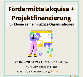 Projektfinanzierung und Fördermittelakquise für kleine Organisationen Ihr habt eine super Projektidee, aber die Finanzierung fehlt? Ihr seid eine gemeinnützige Organisation und benötigt mehr Wissen zu Fördermittelakquise und Projektfinanzierung? Dann haben wir genau das Richtige für Euch: Die VHS Neukölln bietet Ende April einen 3-tägigen Kurs zum Thema Fördermittelakquise und Projektfinanzierung für kleine(re) gemeinnützige Organisationen zu einem ermäßigten Preis an. Neben Informationen zu grundlegendem Wissen zur Förderlandschaft oder zentralen Recherchetools wird konkret an einem Beispiel der gesamte Antragsprozess inklusive Kostenkalkulation durchgespielt. Meldet Euch jetzt an! Der Kurs findet vom 26.-28. April, 9:00-16:00 Uhr, im Kurt-Löwenstein-Haus statt und ist als Bildungszeit anerkannt. Alle Informationen und die Möglichkeit zur Anmeldung findet Ihr hier.