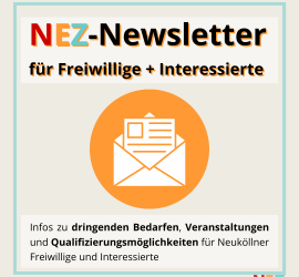 Melde Dich für unseren Newsletter an! Du hast Lust auf ehrenamtliches Engagement in Neukölln oder bist bereits ehrenamtlich aktiv? Du möchtest über aktuelle und dringende Engagementbedarfe von Neuköllner Einrichtungen auf dem Laufenden gehalten werden? Dich interessieren außerdem Qualifizierungsangebote und Veranstaltungen für Neuköllner Freiwillige und Interessierte? Dann meld Dich für unseren NEZ-Newsletter für Freiwillige und Interessierte an! Zur Anmeldung geht es hier entlang: https://nez-neukoelln.de/freiwillige