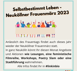 Internationaler Frauentag 2023 Heute ist der 08. März – der Internationale Frauentag. Heute wird weltweit auf die Themen Frauenrechte und Geschlechtergerechtigkeit aufmerksam gemacht. Weltweit gehen Menschen auf die Straße, um für Gleichberechtigung und gegen Diskriminierung zu demonstrieren und ungleiche Machtverhältnisse sichtbar zu machen. International, so auch in Deutschland, sind Frauen häufiger von Gewalt und Armut betroffen. Sie arbeiten öfter in prekären Arbeitsverhältnissen, verdienen weniger Geld und sind sowohl im privaten als auch im öffentlichen Raum von Diskriminierung betroffen. Weiterführende Quellen: Hintergrundinformationen zum Weltfrauentag „Armut trägt noch immer viel zu oft ein weibliches Gesicht“ Lebenssituation, Sicherheit und Gesundheit von Frauen in Deutschland Soziale Situation in Deutschland – Altersarmut Vielfältige Veranstaltungen zum Neuköllner Frauenmärz Anlässlich des Frauentags findet auch dieses Jahr der Neuköllner Frauenmärz unter dem Motto „Selbstbestimmt leben!“ statt. In ganz Neukölln könnt Ihr diesen Monat Angebote und Aktionen, wie Lesungen, eine feministische Filmreihe, Workshops, Poetry Slam oder eine Stadtführung […]