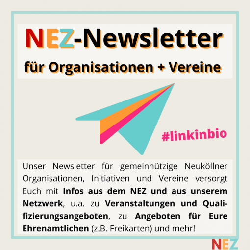 Für die Teilnahme meldet Euch bitte bis zum 17.05.2024 per Mail unter info@nez-neukoelln.de an. Die Teilnehmendenzahl ist auf 20 Personen begrenzt.