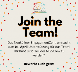 Wir vom Neuköllner EngagementZentrum (NEZ) suchen zum 15. Februar 2023 Verstärkung für unser Team mit dem Schwerpunkt auf Öffentlichkeitsarbeit! Bitte richtet eure Bewerbung ausschließlich an bewerbung[at]awo-suedost.de. Wir freuen uns auf eure Bewerbungen! Projektmitarbeiter*in zum 15. Februar 2023 für das NEZ, mit Schwerpunkt auf Öffentlichkeitsarbeit: