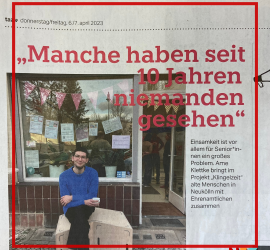 „KlingelZeit“-Interview in der taz Letzte Woche hat die taz ein Interview mit unserem Kollegen Arne zum Besuchs-und Begleitprojekt “KlingelZeit” veröffentlicht. “Wir haben nicht nur Tandems, die aus Jung und Alt bestehen. Wir haben auch viele Senioren, die sich engagieren und mit älteren Leuten treffen. Ich glaube aber, gerade für junge Menschen ist das ein tolles Ehrenamt, weil man superviel für sein eigenes Leben daraus ziehen kann. Es ist spannend, die Historien von älteren Menschen zu erfragen und was die alles schon so in Neukölln erlebt haben.” Das ganze Interview könnt Ihr online hier nachlesen. Möchtet Ihr Euch engagieren oder seid Senior/-in und habt Lust auf Gesellschaft? Dann meldet Euch bei uns! Wenn Ihr in Nordneukölln lebt, könnt Ihr Euch bei Arne Klettke unter 0176 58 85 82 91 melden. Für Bewohner*innen von Buckow, Rudow, Britz und der Gropiusstadt ist Sarah Hannusch unter 0176 73 22 00 15 erreichbar. Mehr Informationen gibt es aber auch unter 0 30 […]