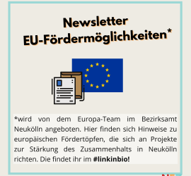 Jetzt Mittel aus EU-Fördertöpfen einwerben! Neukölln lebt von vielen tollen Projekten, die den Zusammenhalt im Bezirk stärken. Das Europa-Team im Bezirksamt Neukölln möchte die Einwerbung von EU-Projektgeldern unterstützen und bietet hierfür einen Newsletter mit Fördermöglichkeiten an. Hier können Sie den Newsletter abonnieren: