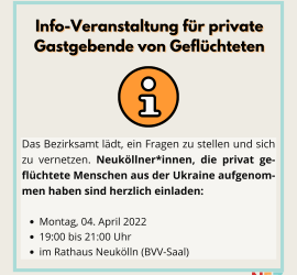 Gern möchten wir euch auf folgende Info-Veranstaltung des Bezirksamts Neukölln hinweisen: Im letzten Monat haben viele private Menschen Geflüchtete aus der Ukraine bei sich zu Hause aufgenommen. Dafür möchte sich das Bezirksamt Neukölln bei allen Gastgebenden herzlich bedanken. Um ihnen die Möglichkeit zu geben, Fragen zu stellen, Antworten zu erhalten und sich untereinander zu vernetzen, lädt das Bezirksamt Neukölln zu einer Informationsveranstaltung am Montag, den 4. April 2022 von 19 bis 21 Uhr im BVV-Saal des Rathaus Neukölln ein. Diese Infoveranstaltung richtet sich ausschließlich an Menschen, die derzeit Geflüchtete aus der Ukraine bei sich privat in Neukölln unterbringen. Bei der Veranstaltung werden Referent:innen aus verschiedenen Fachämtern anwesend sein, um bestehende Fragen zu beantworten und zu Prozessen und Abläufen im Rahmen der Flüchtlingshilfe zu informieren. Wer privat ukrainische Flüchtlinge untergebracht hat und nicht an der Veranstaltung teilnehmen kann, kann sich über die E-Mail-Adresse ukraine-hilft@bezirksamt-neukoelln.de für einen Newsletter anmelden. Mehr Infos […]