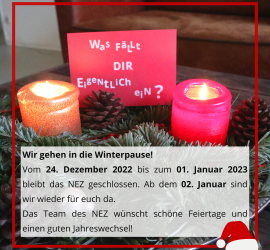 Das Jahr 2022 war in vielerlei Hinsicht ein herausforderndes und bewegtes Jahr. Der Angriffskrieg in der Ukraine und dessen Folgen beeinflusst seit Februar unsere Arbeit. Mit der Ankunft von geflüchteten Menschen aus dem Kriegsgebiet hat sich auch eine große Hilfsbereitschaft und Solidarität in Neukölln gezeigt. An dieser Stelle möchten wir uns noch einmal ganz herzlich bei allen Menschen in Neukölln bedanken, die sich engagierten und sich für ihre Mitmenschen einsetzten! Vom 24. Dezember 2022 bis zum 01. Januar 2023 sind wir in der Weihnachtspause, ab dem 02. Januar 2023 sind wir zu den gewohnten Öffnungszeiten wieder für Euch da. Wir wünschen allen Neuköllnern/-innen schöne Feiertage, einen schönen Jahresabschluss und viel Gesundheit. Es grüßt ganz herzlich zum Jahresende das Team des Neuköllner EngagementZentrums