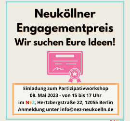 Wir suchen Eure Ideen! Das Bezirksamt Neukölln wird mit Unterstützung des NEZ in diesem Jahr erstmalig den „Neuköllner Engagementpreis“ vergeben.Der Preis richtet sich an ehrenamtliche bzw. hauptsächlich ehrenamtliche Projekte/Vereine/Initiativen. Bestimmte Rahmenbedingungen stehen bereits fest, andere stehen noch zur Diskussion – dafür benötigen wir Eure Unterstützung und Expertise! Gemeinsam mit dem „Mitmachladen Neukölln“ laden wir Euch zu unserem Partizipationsworkshop ein, in dem wir zusammen mit Euch die Ausgestaltung des Preises entwickeln möchten. Der Workshop findet am Montag, den 8. Mai 2023, von 15:00 – 17:00 Uhr im NEZ, Hertzbergstraße 22, 12055 Berlin statt. Welche Rahmenbedingungen stehen bereits fest?– Es werden 3 Preise á 1.000,00 € vergeben.– Es wird ein Bewerbungsverfahren für den Preis geben.– Eine fachübergreifende Jury trifft die Wahl über die Preisträger*innen. Welche Themen sind noch offen und sollen im Workshop diskutiert bzw. entschieden werden?– Es wird einen „Themenpreis“ geben – welches Thema soll für 2023 gewählt werden?– Was […]