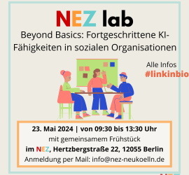 „Beyond Basics: Fortgeschrittene KI-Fähigkeiten in sozialen Organisationen“ am Donnerstag, den 23. Mai 2024 von 09:30 – 13:30 Uhrmit gemeinsamem Frühstückim NEZ, Hertzbergstraße 22, 12055 Berlin Fachreferentinnen:Dr. Violeta Trkulja und Dr. Juliane Stiller von „Grenzenlos Digital e.V.“ Was ist das NEZ lab? Das NEZ lab findet zwei Mal jährlich statt und greift aktuelle Qualifizierungsbedarfe aus unserem Netzwerk auf. Das NEZ lab ist hierbei als Workshop sehr praktisch ausgerichtet. Einerseits werden durch Fachreferenten/-innen neuste Erkenntnisse aus Wissenschaft und Praxis vermittelt, andererseits wird das Erlernte von den Teilnehmenden im Team direkt zur Anwendung kommen. Im NEZ lab sollen also Wissen vermittelt und gleichermaßen praktische Fähigkeiten erlernt werden.Nach einem erfolgreichen NEZ lab im Oktober 2023 mit einer Einführung in den Nutzen von künstlicher Intelligenz in sozialen Organisationen wurde mehrfach der Wunsch geäußert, sich in einem folgenden Workshop noch tiefer mit der Materie auseinander zu setzen. Wir freuen uns, dass wir für diese Vertiefung […]