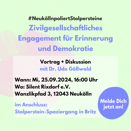 Der Tag der offenen Tür ist auch unser Auftakt zu den Berliner Freiwilligentagen 2021. Vom 10. bis 19. September 2021 bieten wir gemeinsam mit unseren Kooperationspartnern/-innen ein vielfältiges Programm – mit Stolperstein Putz-Spaziergängen, Schnupperengagements in Nord- und Südneukölln und dem Aktionstag am 11. September auf dem Herrfurthplatz. Alle Infos zu den Berliner Freiwilligentagen in Neukölln findet ihr hier!